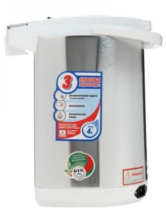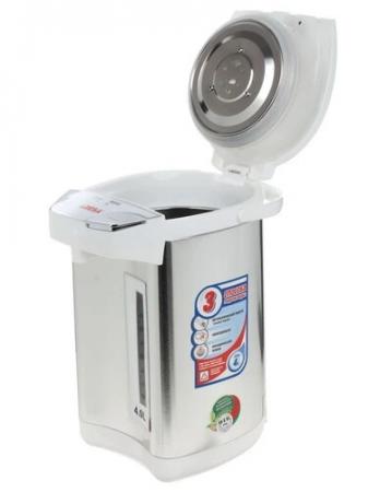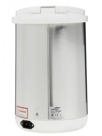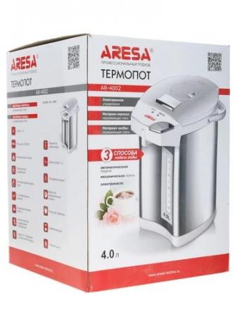 проверить балансТермопот Aresa AR-4002 в лаконичном белом корпусе вмещает 4 л воды. Модель с мощностью 800 Вт радует быстрым кипячением и функцией поддержания температуры. Мерная шкала позволяет контролировать количество оставшейся воды. Конструкция дополнена съемной крышкой, ручкой для переноса и отсоединяемым кабелем питания. Aresa AR-4002 оснащен электрическим и ручным насосом для наливания кипятка в кружку даже при отключении электричества. Подставка позволяет вращать тяжелый корпус в любую сторону. Вы можете блокировать подачу воды для защиты детей от случайного обжигания. Индикация нагрева указывает на процесс кипячения. Защита от перегрева и включения без воды продлевает срок службы термопота.