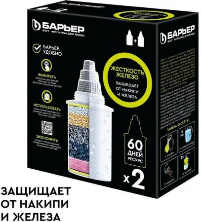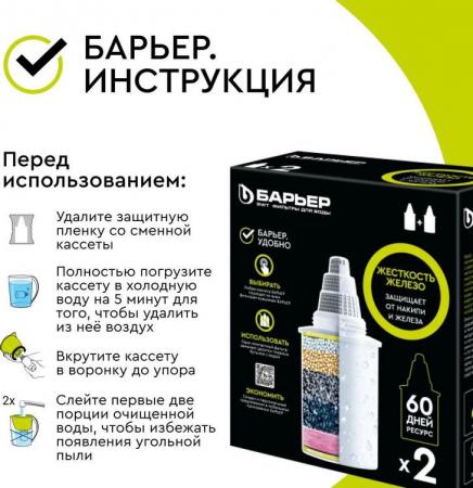 проверить балансКомплект из 2 сменных кассет для фильтра БАРЬЕР Жесткость Железо. Снижает жесткость, которую мы привыкли встречать в жизни в виде накипи, удаляет из воды растворенное железо и неприятный металлический привкус, а также, как и все кассеты БАРЬЕР, очищает от хлора, тяжелых металлов и других вредных примесей. Результат – чистая вода без накипи, рыжеватого осадка и неприятного привкуса. Ресурс каждой кассеты — 350 литров. С фильтрами БАРЬЕР вам не придется запоминать размер или диаметр сменной кассеты: любая кассета БАРЬЕР подходит ко всем фильтрам-кувшинам БАРЬЕР. А герметичное резьбовое соединение исключает попадание неочищенной воды в отфильтрованную. Ресурс зависит от качества исходной воды, но составляет не более 350 литров для каждой кассеты.