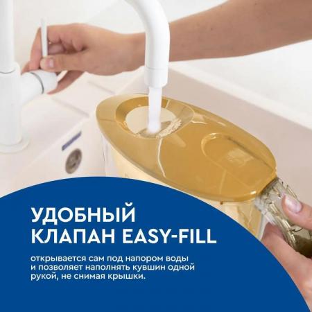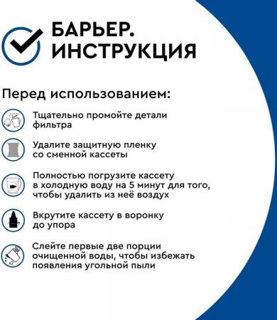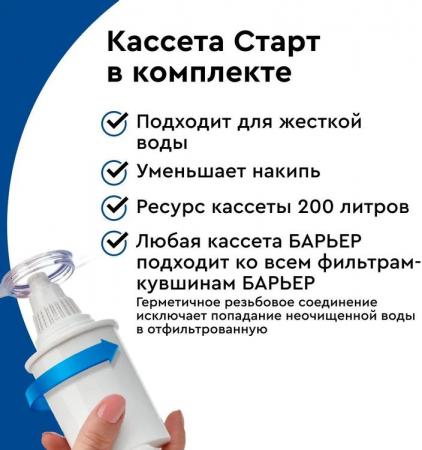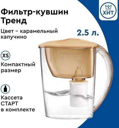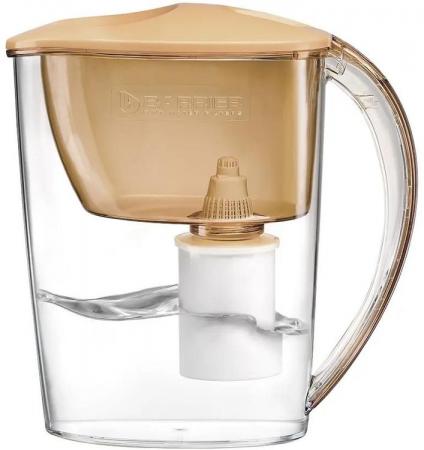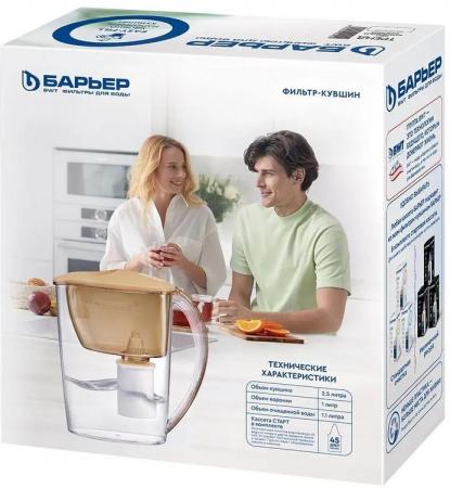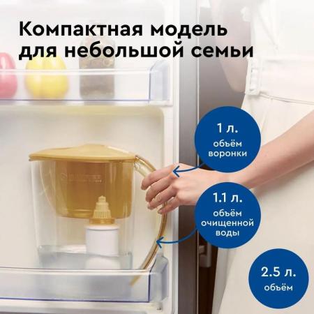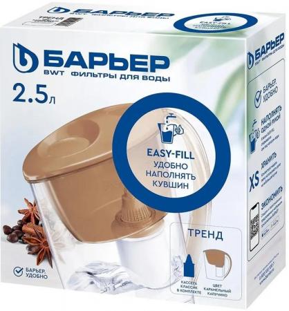 проверить балансУзкий и легкий фильтр-кувшин в приятном карамельном оттенке. Поместится на любой, даже самой маленькой кухне. В жаркие дни поставьте фильтр-кувшин в дверцу холодильника и наслаждайтесь освежающей чистой водой. Объем отфильтрованной воды 1,1 литра. Удобный клапан позволяет наполнить фильтр-кувшин, не снимая крышки. Воронка автоматически откидывается при наклоне кувшина. Герметичное резьбовое соединение исключает попадание неочищенной воды в отфильтрованную. В комплекте с фильтром-кувшином кассета БАРЬЕР Старт. Она умягчает воду, уменьшая образование накипи, защищает от хлора и хлорорганических соединений, тяжелых металлов и других вредных примесей. Удаляет посторонние привкусы и запахи, улучшает вкус воды. Ресурс кассеты — 200 литров.