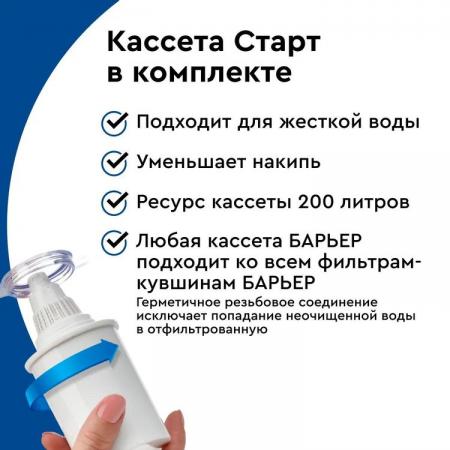 проверить балансФильтр-кувшин Барьер Нова является необходимым аксессуаром в любом доме, ведь он позволит пить исключительно очищенную воду. Особенность кувшина в том, что он позволяет получить очищенную от активного хлора, органических и хлорорганических соединений воду, а также неприятного запаха, благодаря чему вы избавите свой организм от вредных примесей. Пищевой пластик, использованный для изготовления кувшина, создан специально для контакта с питьевой водой, поэтому он не влияет никак на вкус поды и ее запах. Объем кувшина Барьер Нова составляет 2.5 л, а его воронка рассчитана на 1 л. Эргономичный дизайн модели наряду с цельнолитой ручкой способствует комфортному пользованию. Используемая кассета использует резьбу, поэтому нефильтрованная вода не попадет в кувшин. Кувшин в зеленом корпусе оснащен фильтроэлементом, ресурс которого достигает 350 л, что позволяет модели служить пользователю длительное время. Максимальная температура воды в кувшине не должна превышать 40 °С. Конструкция изделия позволяет хранить его в дверце холодильника.