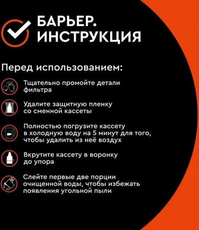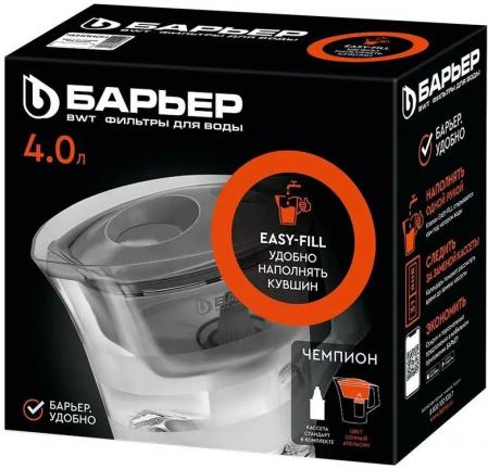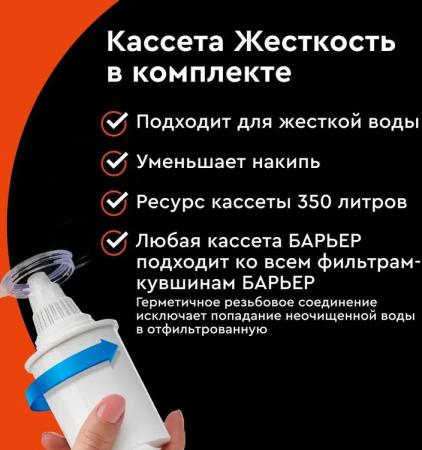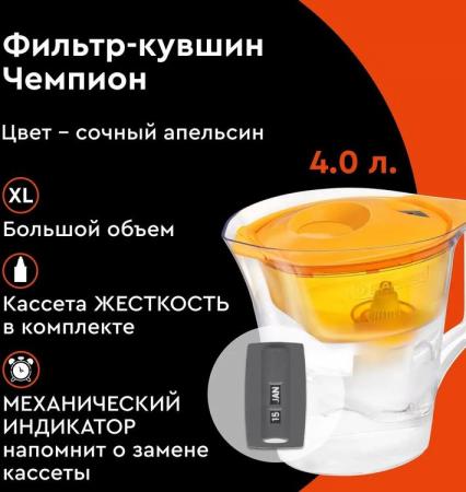 проверить балансВместительный кувшин для всей семьи в ярком оттенке "сочный апельсин". Матовые полосы на корпусе выгодно подчеркивают форму кувшина. Удобный клапан на крышке позволяет наполнить кувшин одной рукой. Механический индикатор подскажет, когда придет время менять кассету. Кувшин можно мыть в посудомоечной машине, за исключением крышки с индикатором. В комплекте с кувшином кассета "БАРЬЕР Стандарт", удаляющая хлор, тяжелые металлы и другие вредные примеси.