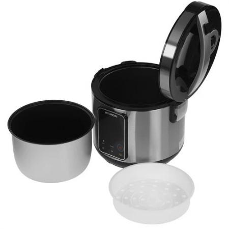 проверить балансМультиварка Hyundai HYMC-2400 с 3D-нагревом дополнена ТЭНами на крышке и по бокам для равномерного запекания продуктов. Чаша на 5 л с тефлоновым покрытием устойчива к прилипанию и пригоранию продуктов. Но такое покрытие легко повредить металлической вилкой или ложкой. Поэтому перемешивать ингредиенты лучше пластиковой, деревянной или силиконовой лопаткой. Hyundai HYMC-2400 выполнена в серебристом корпусе с сенсорным управлением и дисплеем для контроля за выбранными параметрами. 23 автоматические программы позволяют варить супы и каши, тушить и жарить мясо с овощами, выпекать кексы, пиццу и другие блюда. Система автоотключения не требует пристального контроля за работой устройства. Есть функция поддержания тепла по окончании готовки для подачи на стол горячего блюда, таймер отсрочки для запуска мультиварки через 1-24 ч после закладки продуктов.