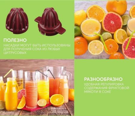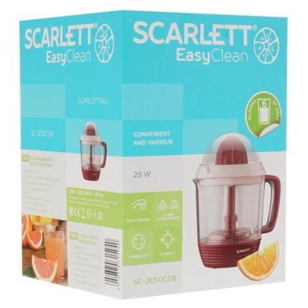 проверить балансСоковыжималка электрическая Scarlett SC-JE50C08 предназначена для приготовления натурального сока из плодов цитрусовых. Она обладает компактными размерами и прозрачным контейнером объемом 1.2 л с мерной шкалой. Для удобного приготовления сока из разных плодов предлагаются 2 сменные конусообразные насадки разного размера. В верхней части имеется защитная крышка. Разборная конструкция позволяет без труда очищать все элементы от загрязнений по завершению процесса приготовления сока. Расположенные на основании ножки гарантируют устойчивое размещение прибора Scarlett SC-JE50C08 на столешнице.
