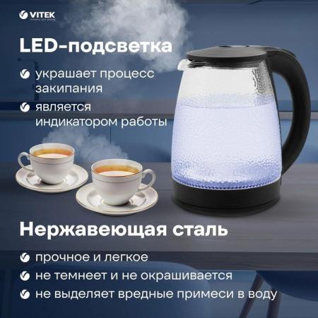 проверить балансЧайник VITEK VT-7003 с корпусом из текстурированного термостойкого стекла с декоративными пластиковыми вставками. Благодаря максимальной мощности 2200 Вт, прибор вскипятит воду (1,7л.) буквально за несколько минут. Красивая внутренняя подсветка корпуса, которая включается в процессе работы устройства, делает его использование особенно приятным. Нагревательный элемент прибора встроен в плоское дно и защищен стальной пластиной, поэтому ухаживать за устройством легко: накипь удаляется после кипячения воды с лимонной кислотой. Пользоваться чайником очень удобно: он способен поворачиваться на 360°, а его крышка открывается механически. После закипания воды или в случае ее отсутствия в устройстве оно автоматически отключается.