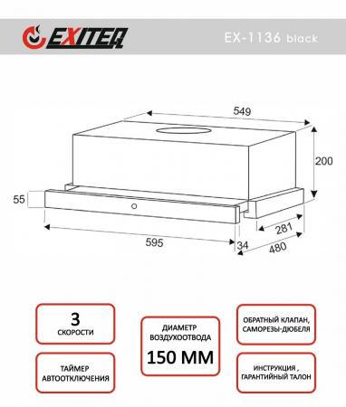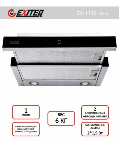 проверить балансВытяжка кухонная встраиваемая телескопическая EX-1136 ПРЕИМУЩЕСТВА:- *Отлично вписывается в практически любой дизайн кухни, почти невидимая.- *Высокая энергоэффективность изделия в сочетании с отличной производительностью.- *Простое и удобное сенсорное управление - включение, подсветка и 3 скорости.- *Комплект угольных фильтров E4CF02 из 2 шт. (докупается отдельно) улавливает до 95% запахов.- *Пониженный уровень шума - на максимальной мощности выдаёт около 44 дБ.- *При правильной эксплуатации жировой фильтр поглощает до 89.2% частичек жира на кухне.- *Быстрая очистка воздуха на кухне благодаря высокой производительности.