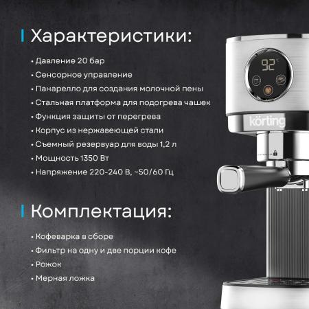 проверить балансКомпактная и стильная кофеварка KCM 1001 EX из нержавеющей стали имеет небольшие размеры, но внутри корпуса скрывает мощную помпу, развивающую давление в 20 бар. Устройство позволяет готовить классические эспрессо, капучино и латте. Удобный в использовании цветной сенсорный экран дает возможность легко выбирать напитки и настраивать размеры порций всего одним касанием, а встроенная система подогрева чашек помогает сохранять оптимальную температуру кофе, способствуя более полному раскрытию его вкуса и аромата. Кофеварка оснащена металлическим рожком с двумя фильтрами на одну или две чашки, а также насадкой-капучинатором для создания густой молочной пены. В комплект входят мерная ложка и уплотнитель для кофе. Противоскользящие ножки надежно удерживают устройство на поверхности, а съемный поддон позволяет использовать более крупные чашки, если это необходимо.