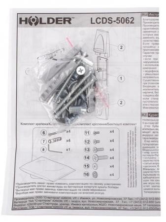 проверить балансУниверсальное крепление для ТВ и мониторов Holder LCDS-5062 представляет из себя кронштейн, предназначенный для жидкокристаллических телевизоров, и, конечно, плазменных панелей, диагональ которых находится в промежутке от 19 до 32 дюймов. От стены до телевизора может быть расстояние, доходящее до 105 миллиметров. Выдержать он может телевизор, вес которого достигает 30 килограммов. Holder LCDS-5062 содержит в наборе крепежи, а также инструкцию, где описан процесс установки. Крепежные отверстия имеют следующие размеры: 75 на 75 миллиметров и 100 на 100 миллиметров. При помощи кронштейна телевизор можно прочно закрепить на стене. Угол наклона также можно изменить, он может находиться в диапазоне от +20 до -20 градусов, а повернуть телевизор можно на 50 градусов. Телевизор можно быть размещен в любой части комнаты, а размещение в углу будет вообще оптимальным вариантом. Для студий и больших комнат установка телевизора также не создаст особых проблем.